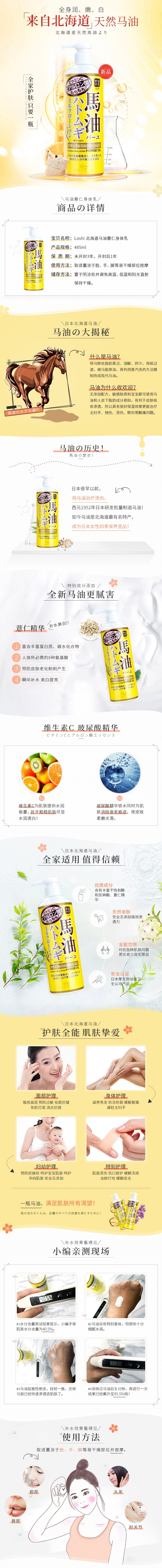 含有北海道純天然馬油成分,其高效滲透力能迅速被肌膚吸收,形成保護膜防止水分流失,同時修復受損角質層。日本Loshi 北海道馬油身體乳液 滋潤補水保濕 485ml 不僅改善乾燥狀態,更讓肌膚觸感柔滑細緻。