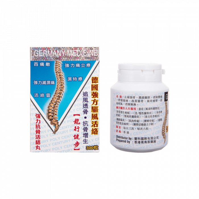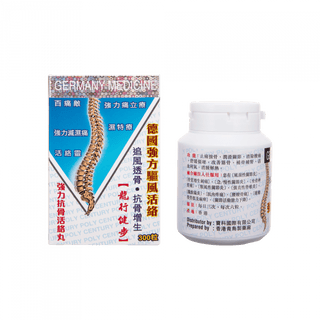 是目前最新之中成藥制劑,現今市面上大多數風濕病制劑多采用化學藥物合成,副作用極大,甚至破壞體內機能組織(尤其曾有過胃部冷頭疾患者)。德國強方「強力抗骨活絡丸」是選用純天然中草藥配制合成,無副作用,有效強化軟骨細胞,改善關節磨觸問題,促進鈣質吸收,強壯骨骼,長期服用對風濕症、骨刺、痛風、肌肉痛、不損腸內臟及胃部並具消炎、消腫、解熱之功。各種症痛患者均可服用。
