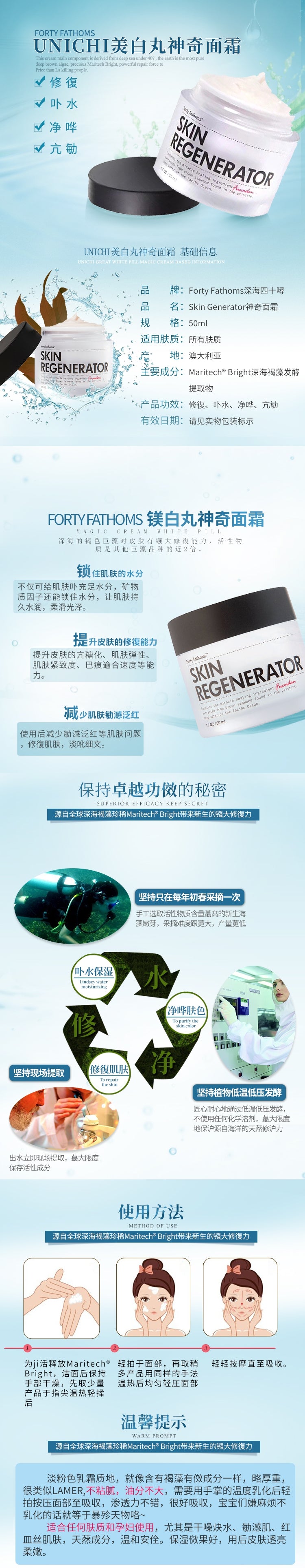 Unichi - 深海四十噚神奇修復精華面霜 50ml 是專為需要深層滋養與修復的肌膚設計的面霜。很多人在日常護膚中會遇到乾燥、暗沉甚至細紋問題,這些都因缺乏有效滋潤而加劇。這款面霜以其獨特的配方,有效緩解肌膚不適,恢復健康光澤。